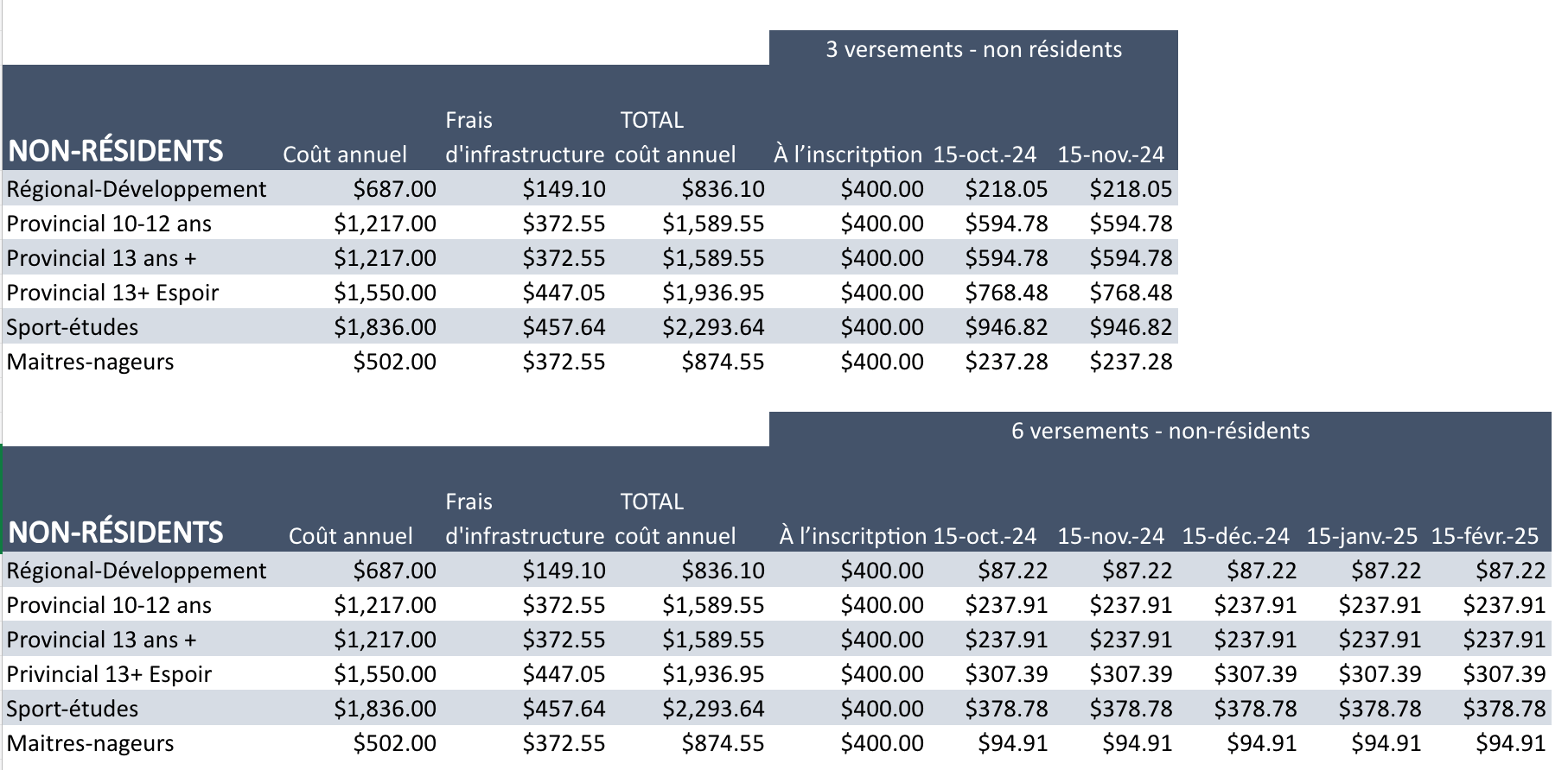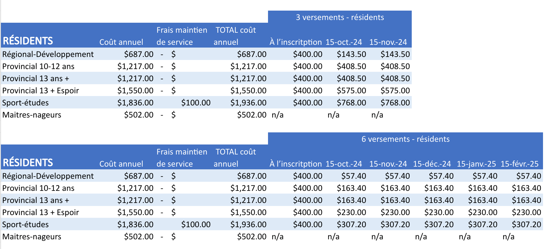 Voici la tarification 2024-2025 – CHÈQUES POST-DATÉS POUR L’INSCRIPTION ANNUELLE