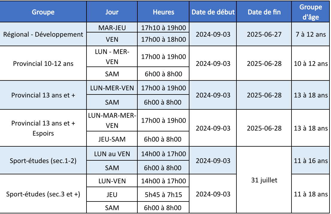 • Provincial 13+ espoir: lundi, mardi, mercredi & vendredi – 17h00 à 19h00, samedi – 6h00 à 8h00