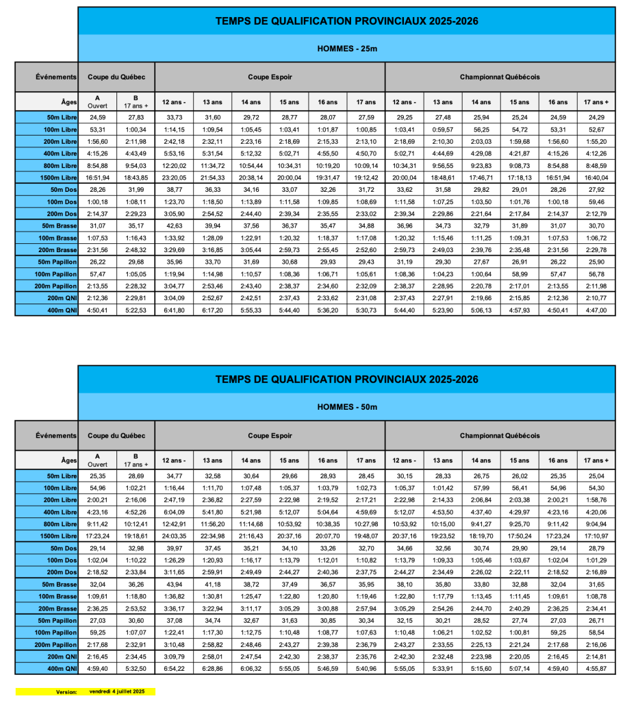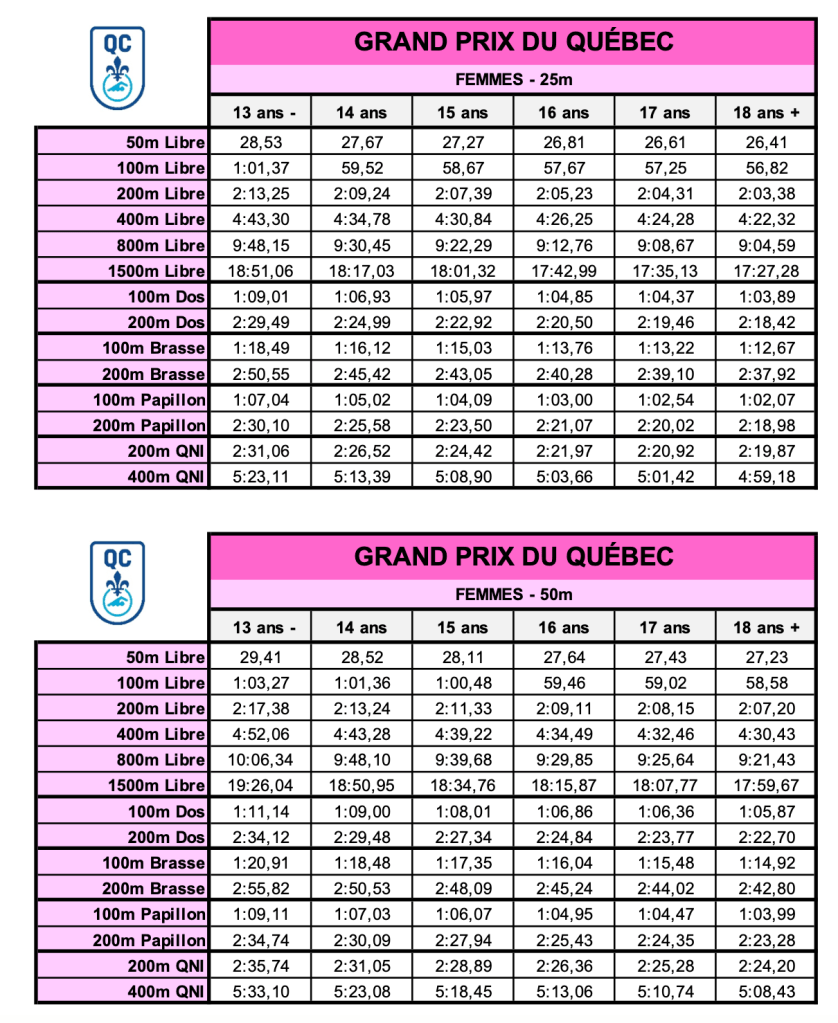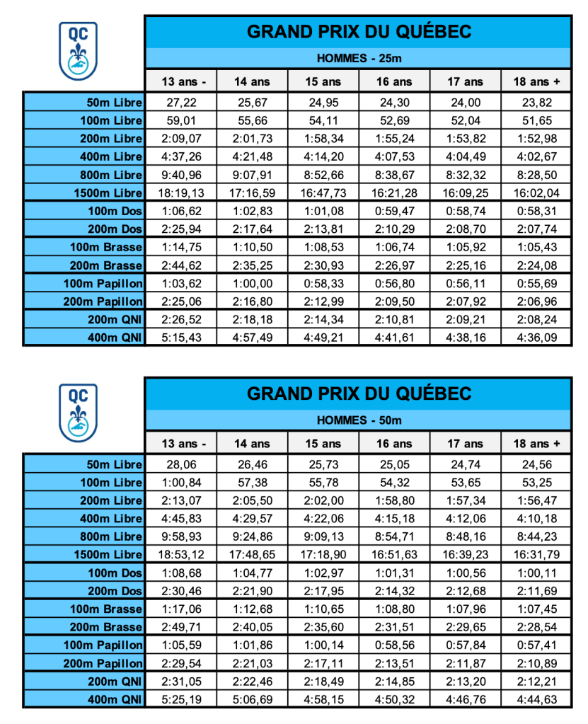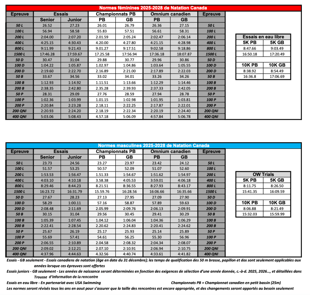 Référence pour les normes nationales: https://www.swimming.ca/fr/normes-et-information-preliminaire-sur-les-competitions/