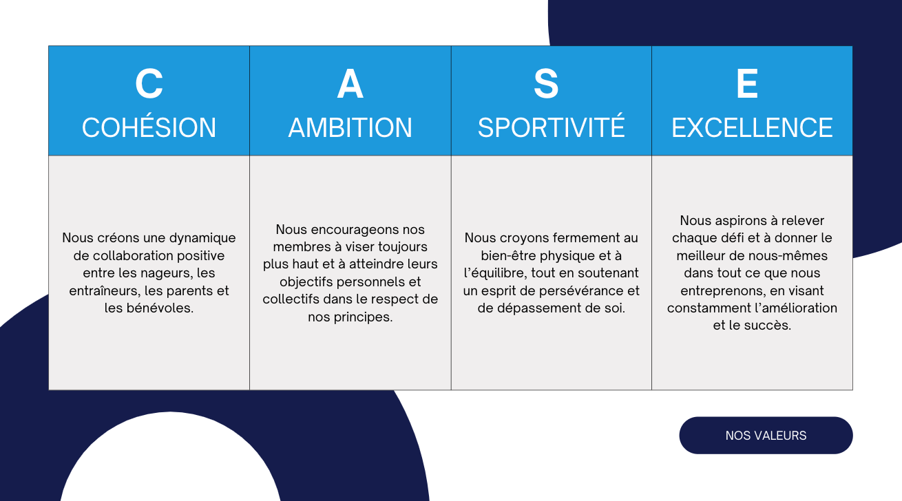 Depuis 1977, le CASE s’engage à donner les meilleurs outils dans le développement de l’excellence de ses membres ainsi que de promouvoir, d’encourager et de favoriser le développement des jeunes athlètes dans l’activité de la natation pour atteinte d’une bonne santé mentale et physique.