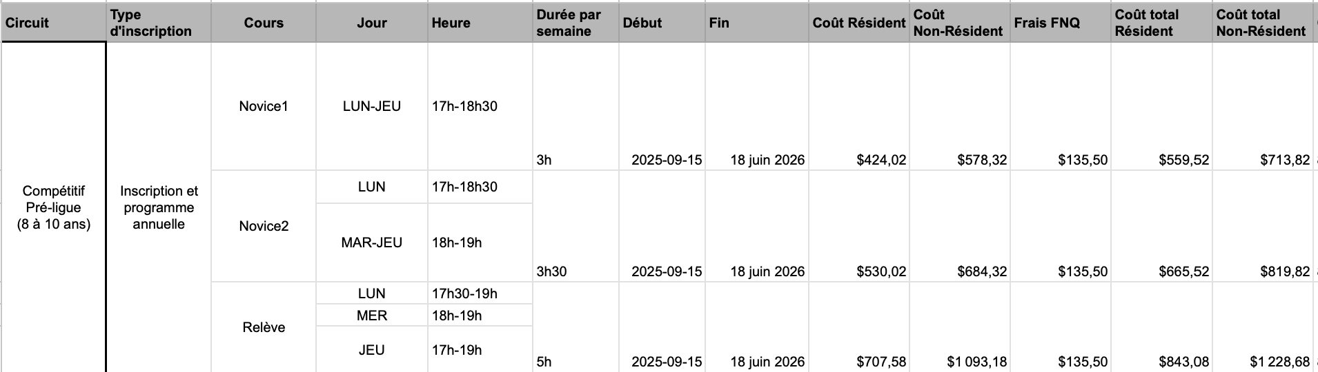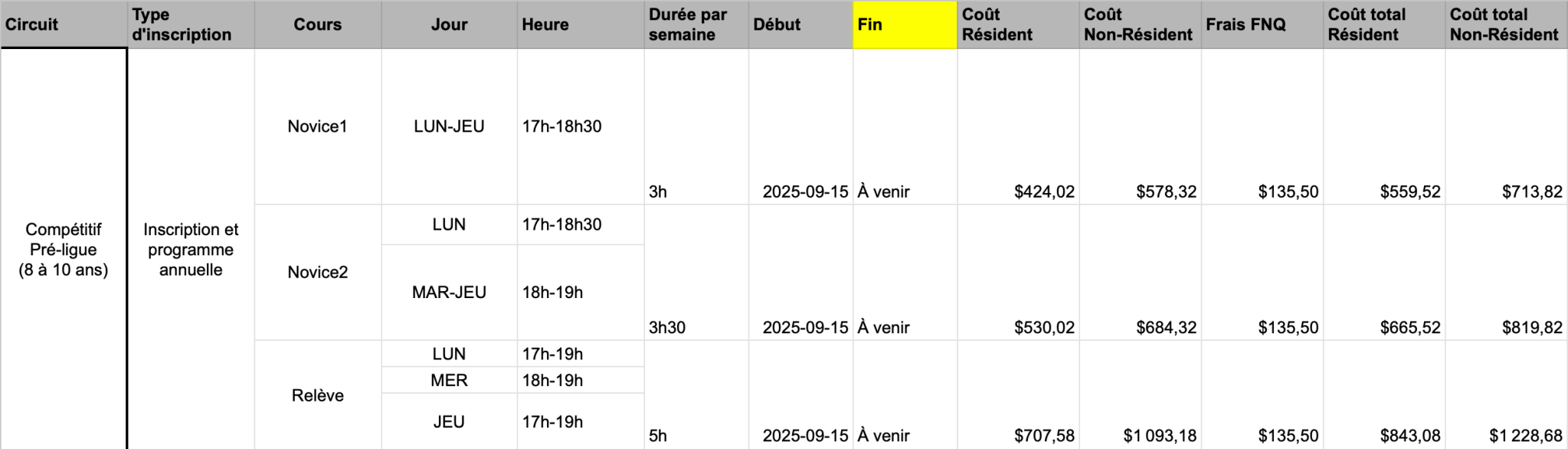 - Novice 1 : 2 entraînements par semaine